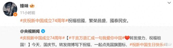 10月1日当天,娱乐圈很多明星名人都纷纷发文庆祝国庆。其中不乏一些香港和台湾的艺人,他们的发声格外引人关注。