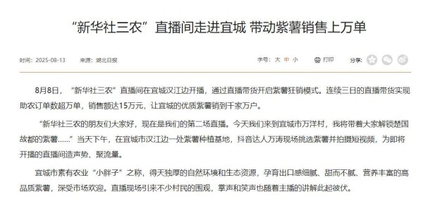 推宜城紫薯时,3天卖出上万单;售利川红茶,9小时卖完682万元库存,相关话题#新华社助农#阅读量轻松破亿。