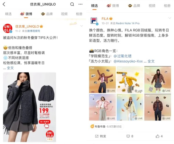 如同是海外品牌的优衣库,便持续发布氛围感围巾系法、牛仔裤的N种可能、秋冬搭配等用户向内容,拉近品牌与消费的距离;FILA也通过新品发布、穿搭展示、代言人品牌短片等内容来强调品牌形象,与粉丝进行更深度互动。