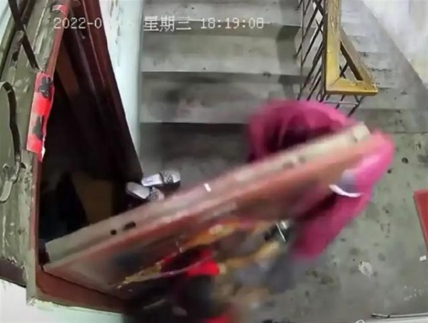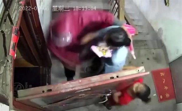 视频上显示的时间为2022年7月6日18时19分左右。在一栋老旧居民楼内,一名女子带着一名小女孩回家,女子帮小女孩背着书包,两人疑似一对母女。