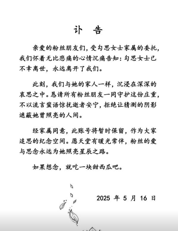 勾思去世的消息公布后,她的家人和公司决定保留她的社交账号,作为粉丝们纪念她的空间。
