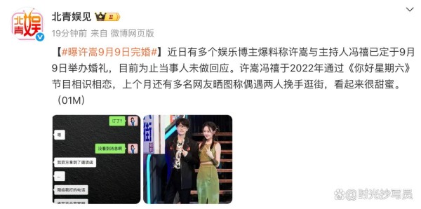 近日,歌手许嵩与主持人冯禧被传将于9月9日举办婚礼的消息引发热议。尽管双方尚未正式回应,但两人自2022年通过《你好星期六》相识相恋以来,多次被网友捕捉到甜蜜互动,感情稳定已成公开秘密。