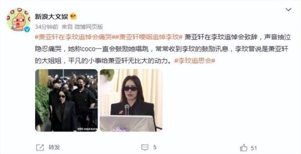 萧亚轩在李玟追悼会痛哭的背后,是一段怎样的姐妹情?