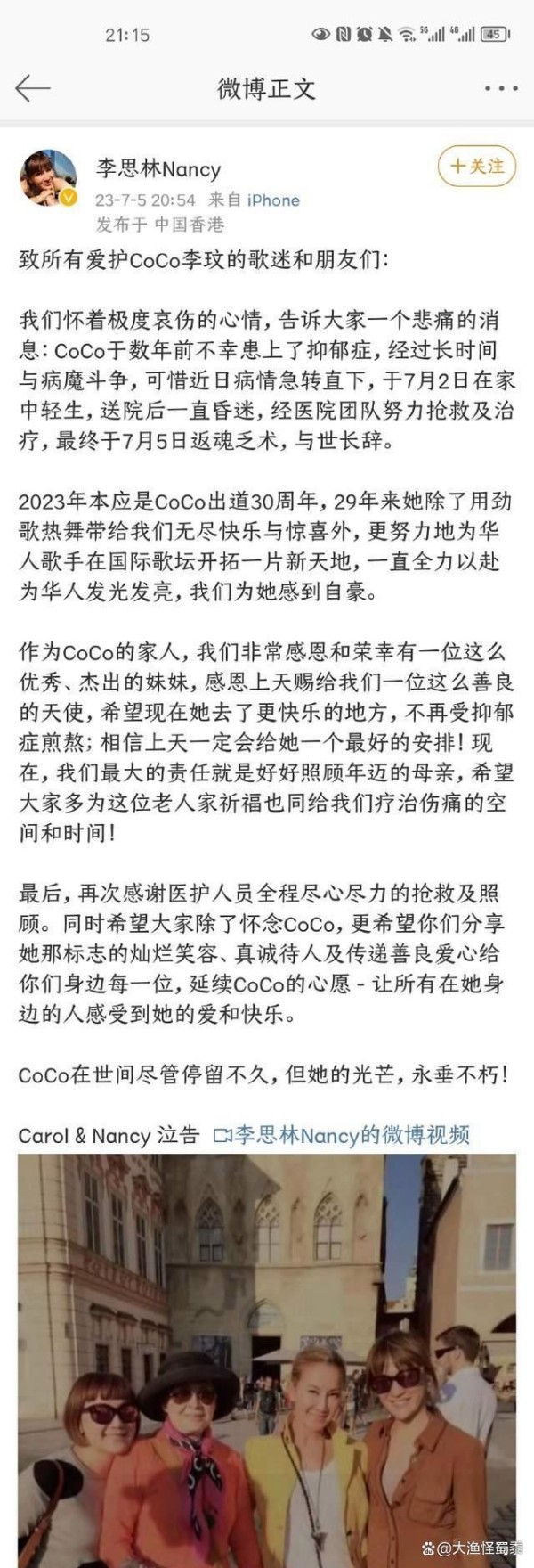 48岁乐坛天后COCO李玟64老公多次出轨,确诊抑郁症去世,40亿遗产全部留给母亲