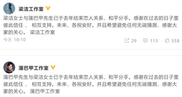 2021年5月18日,蒲巴甲和梁洁的彼此个人工作室,都是在新浪微博公布申明公布分手,申明称两个人已于上年完毕情侣关联,友谊分手,而且期待防止一切无缘无故猜想,感谢大家的关注。#蒲巴甲梁洁官宣分手#