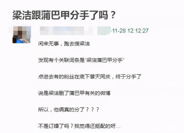 11月28日,有网友发现了一个"梁洁蒲巴甲分手"的词条,点进去后发现女方粉丝都在庆祝,原因是梁洁删除了蒲巴甲的所有相关内容,两人疑似已经分手。更重要的是,两年前梁洁转发的蒲巴甲求婚照也已消失不见,可见两人的感情确实出现了危机。