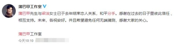 就在他们官宣的5分钟之前,两人的工作室先发布了声明,工作室表明蒲巴甲与梁洁在去年就已经分手,希望网友们不要无端猜测。