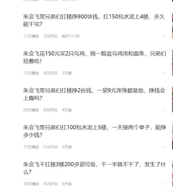 但是朱会飞用实际的行动告诉了大家,他为了接活想尽办法,毕竟自媒体风口慢慢的要过去。还是要干实际活才行,朱会飞去了山东干扛楼,很快播放量还是有了起色。目前团队已经发展到了五六个人,有活从不挑与嫌弃,有活就一起干,没事就一起改善伙食。