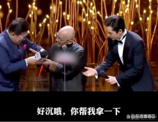 发表获奖感言的时候,游本昌先生突然看了看身旁的主持人,同时看了看手中的奖杯,小声说道:“好沉,帮我拿一下。”旁边的嘉宾胡歌听到游本昌老爷子的话,连忙接过手中的奖杯。