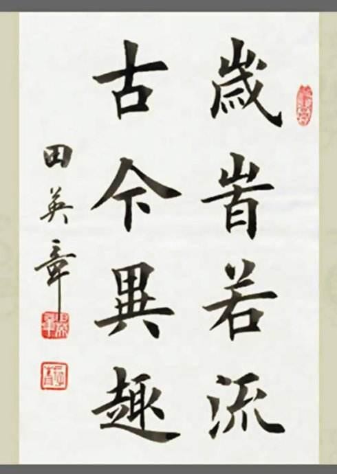 而有一个问题值得注意,那就是现在的书友更喜欢称他们的楷书为“田楷”而不是欧楷,这是为什么呢?以姓氏来称某个人的书法,这是不是要和历史上的欧颜柳赵齐名呢?其实不然,只是以田英章为代表的这种书体太多了,很多人在学习,所以就把这种普遍的书体称为“田楷”。
