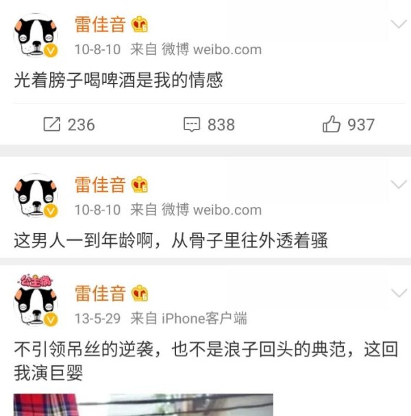 如果唐嫣的微博是磕CP的话,雷佳音的微博啧处处带着沙雕和自恋的气息,不愧是和郭京飞成为好友的人,骨子里的搞怪沙雕真的是掩藏不住呀,难怪他们和李光洁会组成老TFBOYS了。