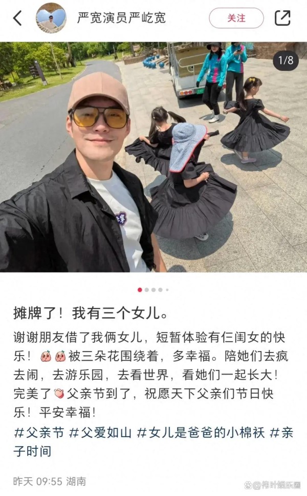 近日,严宽在父亲节当天分享了一组照片。画面中,他与三个“女儿”共度的欢乐时光,充分展现了这个家庭的幸福与温馨。