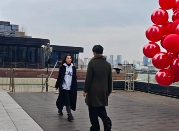 严屹宽穿墨绿大衣和围巾,三七分短发显得年轻,不像46岁。杜若溪黑色大衣配卫衣和鲨鱼裤,袜套时髦,身材细长,像20多岁模特。他们站在上海外滩,繁华夜色和红气球背景,深情望,慢慢走近,画面美。