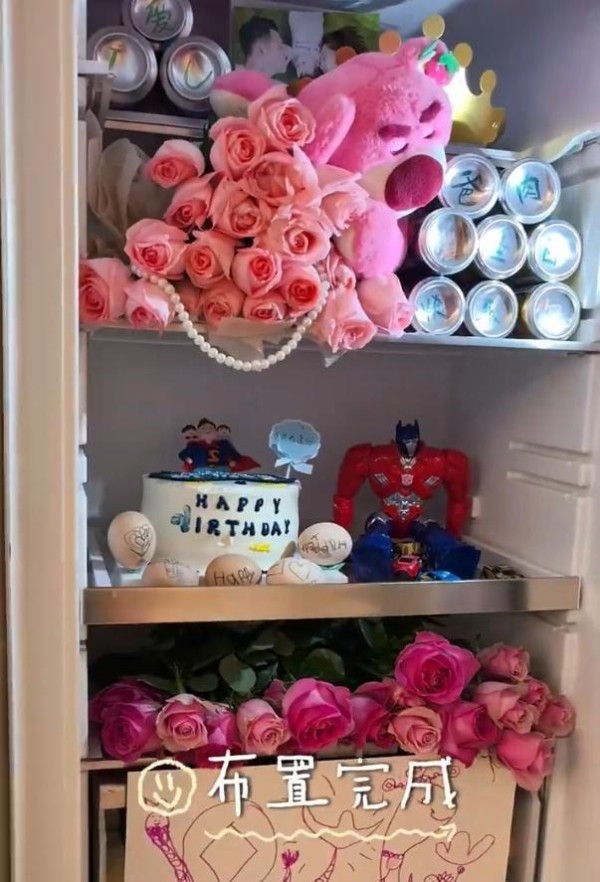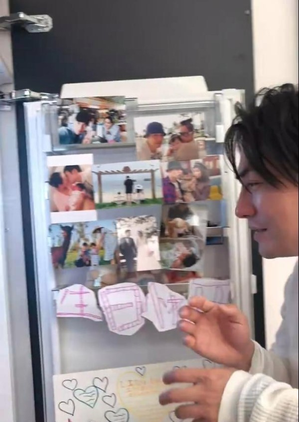 冰箱里放满了花、蛋糕和酒,还有孩子画的画,让家更温馨。冰箱门上挂着他们家的照片,有在医院等着生宝宝的,有出去旅游的,每一张都记下了他们一起的美好回忆。