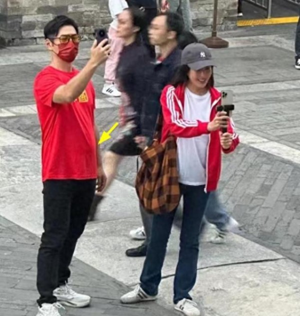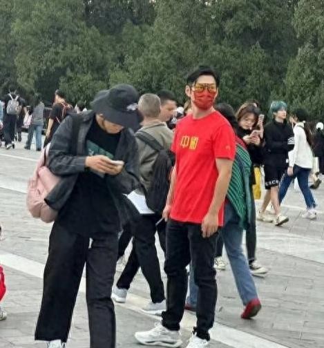 严宽杜若溪天坛被偶遇,穿中国红上衣分外扎眼,一身行头不过千元