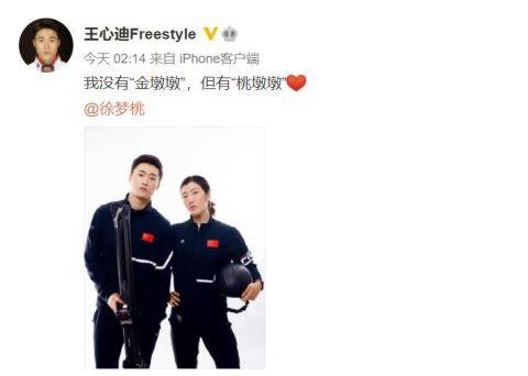 王心迪率先在凌晨2点14分发文,他在社交媒体上晒出了自己同徐梦桃的合照,然后配文“我没有金墩墩,但有桃墩墩”。