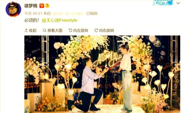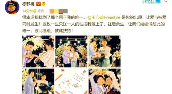 在这场浪漫的求婚活动中,女主角徐梦桃怀抱着一束娇艳的玫瑰,幸福的笑容洋溢在她的脸上,感动之处更是数度落泪。而男主角王心迪,则以标准的求婚姿势出现在镜头前,他单膝跪地,手中握着那枚象征着爱情的戒指,深情地凝视着徐梦桃。两人互相称对方为唯一,并甜蜜地比心拍照留念。值得注意的是,王心迪送给徐梦桃的求婚戒指,是一生仅可赠予一人的DR戒指。从照片中可以看出,徐梦桃对这枚戒指非常满意,甚至展示了钻戒证书。
