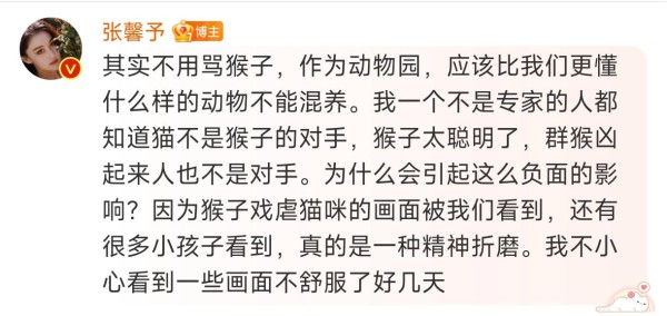 张馨予在评论区进一步解释说:其实不用骂猴子,作为动物园,应该比我们更懂什么样的动物不能混养。我一个不是专家的人都知道猫不是猴子的对手,猴子太聪明了,群猴凶起来人也不是对手。为什么会引起这么负面的影响?因为猴子戏虐猫咪的画面被我们看到,还有很多小孩子看到,真的是一种精神折磨。我不小心看到一些画面不舒服了好几天。