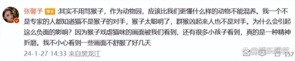 在评论区里,张馨予补充道:“其实不用骂猴子,作为动物园,应该比我们更懂什么样的动物不能混养。我一个不是专家的人都知道猫不是猴子的对手,猴子太聪明了,群猴凶起来人也不是对手。为什么会引起这么负面的影响?因为猴子戏虐猫咪的画面被我们看到,还有很多小孩子看到,真的是一种精神折磨。我不小心看到一些画面不舒服了好几天。”