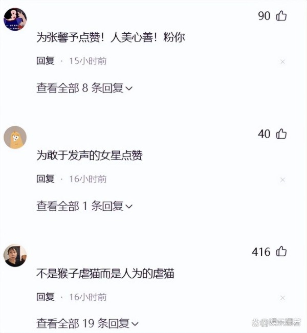 张馨予的仗义执言获得了不少网友的支持,有网友同意张馨予的看法,认为“不是猴子虐猫而是人为的虐猫”,还有网友夸赞张馨予人美心善、“为敢于发声的女星点赞”。