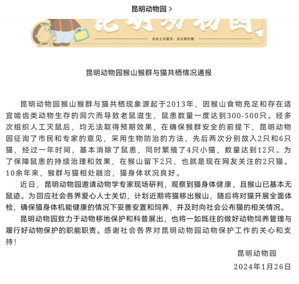 1月26日,昆明动物园再次发布情况通报,称猴山猴群与猫共栖现象源起于2013年,因猴山食物充足和存在适宜啮齿类动物生存的洞穴而导致老鼠滋生,鼠患数量一度达到300-500只。经多次组织人工灭鼠后,均无法取得预期效果,在确保猴群安全的前提下,昆明动物园征询了市民和专家的意见,采用生物防治的方法,先后两次分别放入2只猴和6只猫,经过一年时间,基本消除了鼠患,同时繁殖了4只小猫,数量达到12只。为了保障鼠患的持续治理和效果,在猴山留下2只,也就是现在网友关注的2只猫。10余年来,猴群与猫相处融洽,猫身体状况良好。