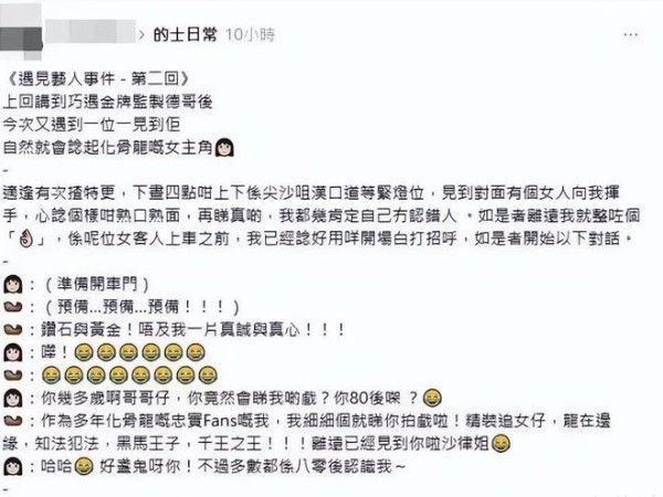 前段时间,还有一位幸运的粉丝,在尖沙咀偶遇了她。这位粉丝是个出租车司机,一眼就认出了关秀媚,还用《千王之王2000》里的经典台词“钻石与黄金”和她相认。没想到,关秀媚竟然很开心地回应了,还主动和粉丝聊了起来。