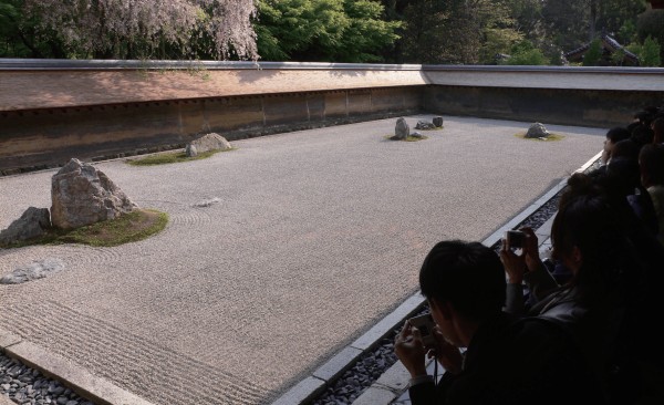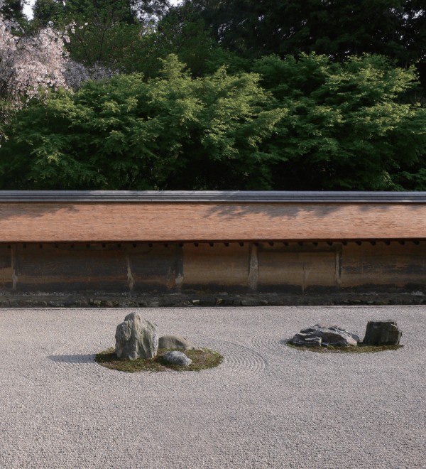 龙安寺枯山水的建造技艺和结构美学也值得一提。平整的砂石面略微向东南角倾斜以利于排水,围墙的高度也经过精密计算,利用透视加深整个庭园在视觉上的纵深感,同时还可以在多个比例上分析出黄金分割律。1954年,石庭被指定为国家特别名胜,龙安寺的人气逐渐高涨。1975年,英国女王伊丽莎白二世参观了龙安寺石庭,在当时的禅修热潮的推动下,龙安寺闻名世界。