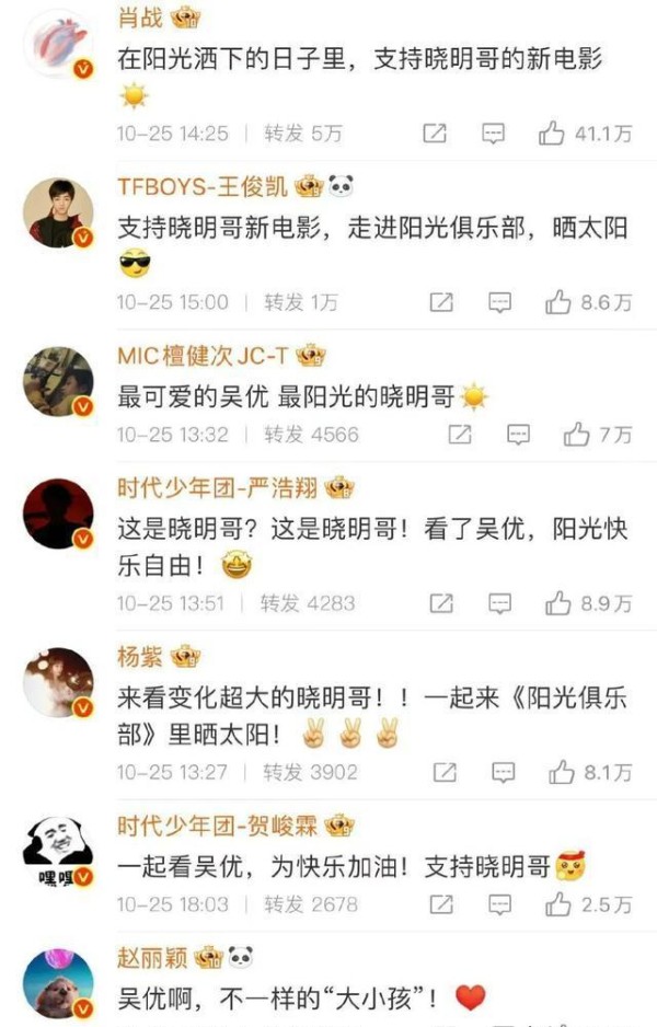 10月下旬,黄晓明的新片《阳光俱乐部》全国公映,按老规矩——主演在社交平台上发条动态请大家“捧场”。不到几分钟,娱乐圈的好友们就纷纷上线打call:肖战、赵丽颖、周冬雨、杨紫、王俊凯、檀健次、贾乃亮、陈赫、蒋欣、岳云鹏、张天爱……这一串名字本身就是一张人缘名片,把黄晓明这块“情义牌”亮得明明白白。