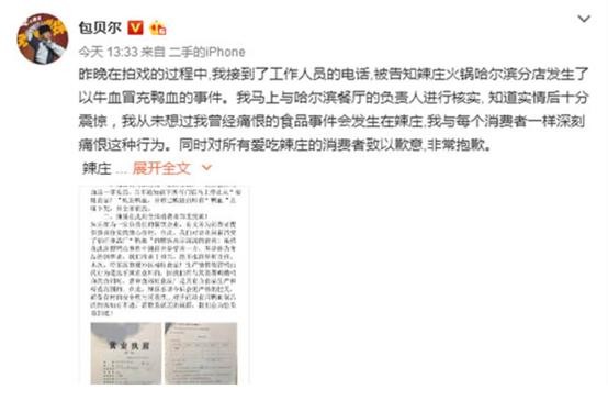 而这一点,恰恰是很多明星开店中的短板,因为大部分明星并具备餐饮行业的管理运营经验。包贝尔的“辣庄火锅”就因为管理问题,被曝光使用牛血代替鸭血,甚至鸭血是用牛血兑水而成,包贝尔本人还亲自为“鸭血事件”发微博道歉。