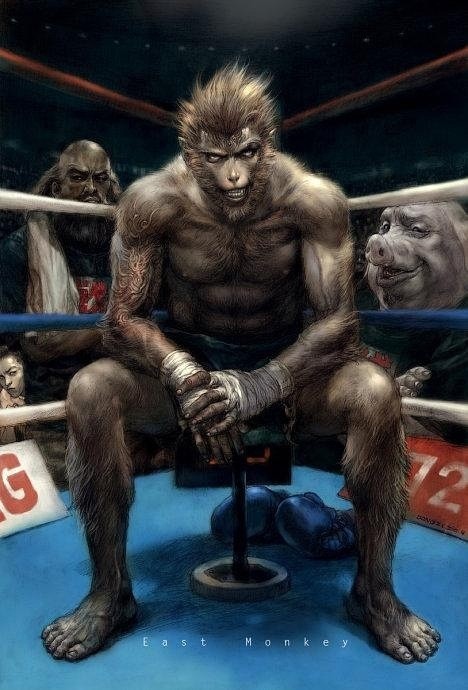 崇拜孙悟空,是因为向往力量;对西部片、帮派片“完全脑残的着迷”,是因为向往力量,练泰拳,成了格斗迷,也是因为向往力量,似乎从青春期开始,“力量”便在冬子脑中挥之不去,他自言“人缺什么就向往什么”。正因为他一直觉得自己缺的是力量,才得以在追求力量的过程中变得强大,远远强大过其他人——这并不单纯在肉体,更多在精神。因为追求力量,他可以对世界格斗竞技赛事、明星如数家珍,自己也在拳馆修习泰拳,并自然而然将动作场面揉进画里,《皇室血统》也好,《西游记》也好,至今网上流传很广的一张刘冬子作品,便是孙悟空在拳击场中央、眼神凌厉的造型插画,很有点米基•洛克的感觉。我的另一个敏感问题是,“你觉得力量和暴力的界限在哪里?”,“就是……动不动手吧,哈哈”,冬子用一句玩笑化解了尖锐,“我有力量,只是自强,并没有对别人暴力”,聊到拳时,冬子的感触甚至带点百转千回的意味“拳头是一个比较像水的东西,随变”。所以他画中的拳也从未追求“戾”。