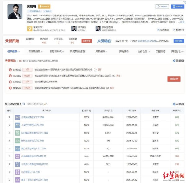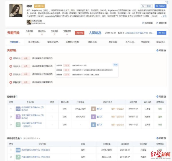 【#黄晓明关联公司48家均与杨颖无关联#】1月28日,黄晓明、杨颖(Angelababy)微博发文,官宣离婚。此前,黄晓明被曝出持股274家企业,但均与Angelababy无关。熟悉黄晓明的人都知道,他是个很有商业头脑的明星。天眼查APP显示,黄晓明的关联公司有48家,其中存续状态有32家,包括北京明嘉投资管理有限公司、北京易乾影视文化工作室等,涉及影视、餐饮、科技、服饰、商贸、投资等多个领域。所有存续企业中,黄晓明担任5家公司的法定代表人、31家公司的股东,并在3家企业中任职高管。 杨颖关联的公司共3家,包括徐州欢颖文化传媒中心(有限合伙)、天津天颖文化传播中心(有限合伙)、上海光颖文化传播工作室(有限合伙),杨颖均担任股东,持股比例均为99%。从两人关联企业来看,黄晓明与杨颖并无直接商业关联。#黄晓明angelababy离婚#