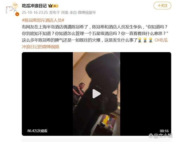 10月17日,一则陈冠希在上海半岛酒店与工作人员发生争执的视频,在网络上迅速流传开来,瞬间点燃了吃瓜群众的围观热情。视频中,这位久未以如此方式登上热搜的明星,情绪激动地连续质问对方:“你知道吗?你到底知不知道?你知道怎么管理一个五星级酒店吗?你一直看着我什么意思?”