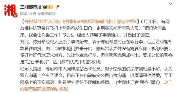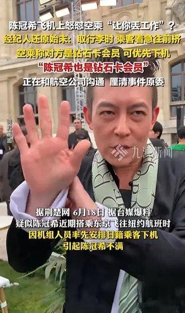 空乘称对方是“钻石卡会员”可优先下机,而经纪人强调陈冠希本人也是钻石卡会员,认为沟通误会导致冲突