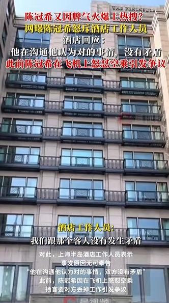 10月中旬,一段疑似陈冠希在上海半岛酒店与酒店人员发生激烈争执的视频在网络热传——据大河报转发的现场视频显示,片段中有争吵和质问声;这与他今年6月在航班上的争执报道被拿来对照,引发关注。