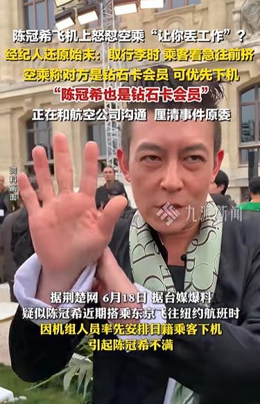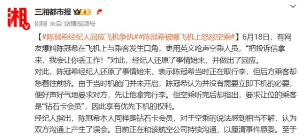 关于6月的事,已有媒体报道:据三湘都市报援引经纪人回应,6月18日陈冠希在飞机上与空乘/乘客发生口角,经纪人称系排队取行李与“钻石卡”优先下机的安排产生误会,正在与航司沟通;荆楚网也转述了台媒对航班安排的相关爆料。