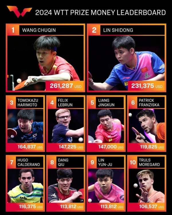 WTT奖金榜公布,钱真少,王楚钦、王曼昱分别位列男女运动员首位。王楚钦在今年拿到了261287美元,林诗栋231375美元是第二名,张本智和164837美元是第三名。女子奖金榜是王曼昱244325美元,孙颖莎234962美元。
