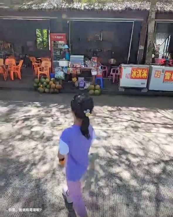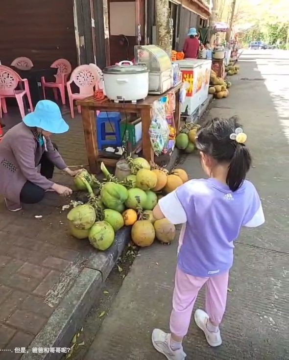 爷俩路过了一家冷饮店,门口堆放着一些椰子,正好口渴了,女儿笑笑就说上去买个椰子喝椰汁,小家伙随身带着一个零钱包,父亲让她自己去买,锻炼她独立生活的能力。