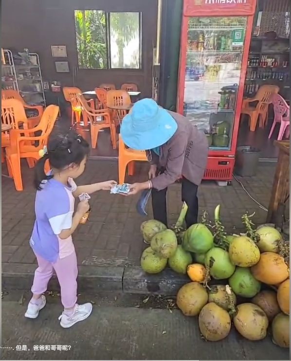 笑笑走过去问店主,椰子多少钱一个,店主告诉她10元钱一个,笑笑非常谨慎地打开自己的零钱包,先掏出了一个5元,店主笑着说,“你没有,爸爸也会有的。”