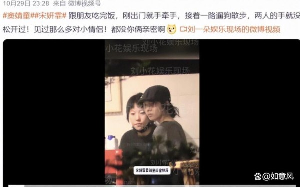江一燕离婚的消息还没平静。这时,另一段视频在 10 月 30 日下午传了出来。视频里,窦靖童和宋妍霏吃完饭出来遛狗。她们从出门手就一直拉着。网友马上觉得事情不对。