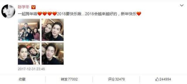 郭敬明比较低调,微博上没有发晒照片,不过陈学冬却高调地晒起了几个人的合照,并写到:一起跨年咯,2018要快乐哦,2018会越来越好的,新年快乐。