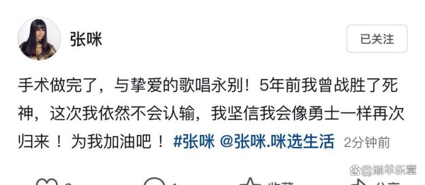 十一月二十六日,五十四岁的张咪又一次在视频网站露面。这是她公开自己第三次罹患癌症(舌癌)后,第一次和大家见面。手术做了六个小时,现在感觉还好。不过,她最爱的唱歌,怕是再也唱不了了。