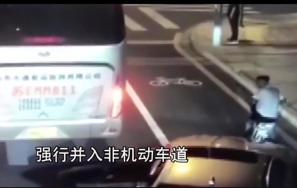 一辆原本应该行驶在机动车道上的宝马,因为要拐到非机动车道上而撞上了自行车。