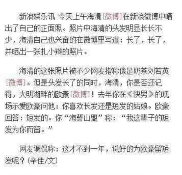 她还曾当面问过欧豪,问他喜欢长头发的还是短头发的,欧豪则为了照顾海清的面子回答了:“短发。”没想到海清当即回复了一句“这辈子,我的短发
