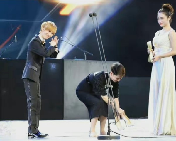 郭敬明在听到大屏幕上喊出自己名字时十分高兴,他认真的整理了西装然后缓缓走上台,正当他准备接过奖杯的那一刻,海清却突然把奖杯还给了礼仪小姐,然后直接蹲下身子把自己的高跟鞋脱了。