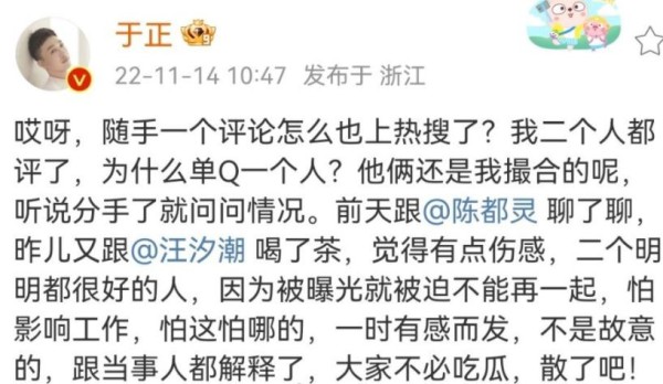 11月14日,于正写小作文坐实了陈都灵和汪汐潮恋情,引发网友吐槽。