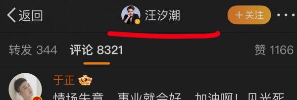 于正在微博上回复汪汐潮的恋情,表示:「感情上的挫折,会有好的工作,好好努力!如果你的爱是不可靠的,那就算了!”