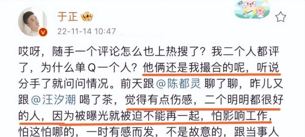 大家也都感觉到于正的行为不对,在抱怨他的不公平,他也很憋屈,所以特意在微博上澄清了自己的清白,同时也把陈都灵和汪汐潮的关系曝光了出来。