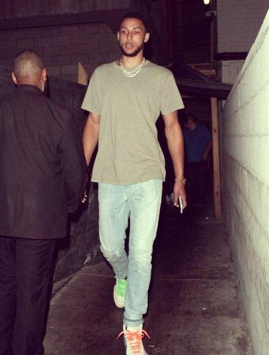 个人出行时,西蒙斯同样展现了出色的穿衣风格。他选择了一件浅灰色的T恤,搭配牛仔长裤,整体造型既休闲又不失活力。特别引人注目的是他脚上的运动鞋,橙色的鞋带与钻石项链相互映衬,成为了整体造型的点睛之笔。无疑,拥有大长腿的男生在穿搭上确实占据着得天独厚的优势。