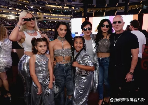 看演唱会的同时,金还遇到了熟人,亚马逊创始人杰夫·贝索斯和未婚妻劳伦·桑切斯,劳伦也为了切题,穿了一件银色透视短上衣。金带着全家人和这对夫妇亲密合影。