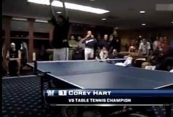 结果第一位叫Corey Hart的挑战者居然还赢了大魔王一分,直接正面扣杀,得分后的他激动的怒吼起来,旁边的人也为他鼓掌喝彩。